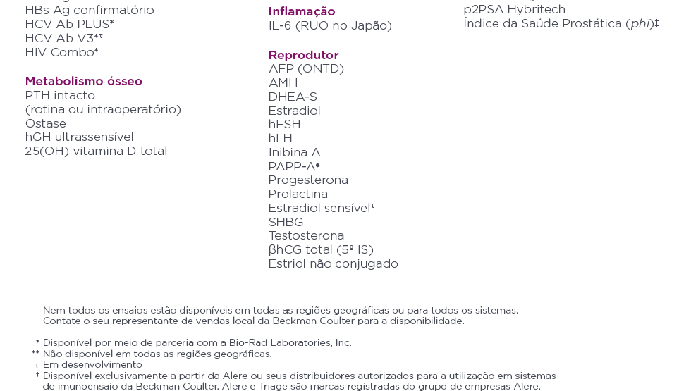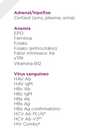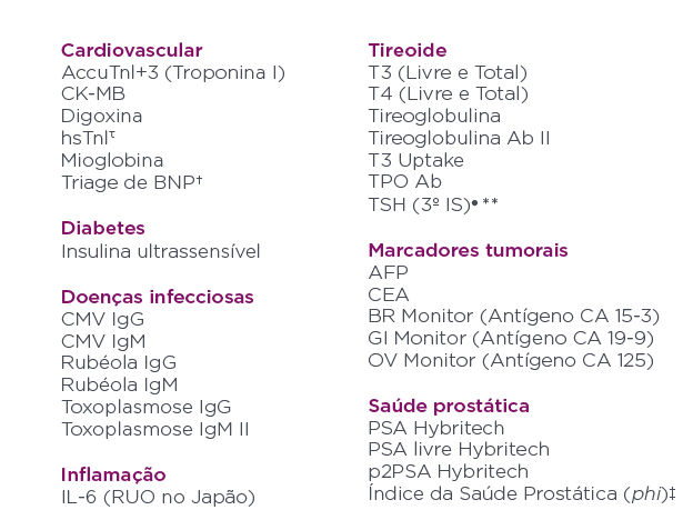› Ensaios confiáveis, incluindo o AccuTnl+3, testes inovadores, tais como de Hormônio Anti-Mülleriano e TSH (3o IS),** e o ensaio de p2PSA, que possibilita o cálculo do Índice de Saúde Prostática (phi).